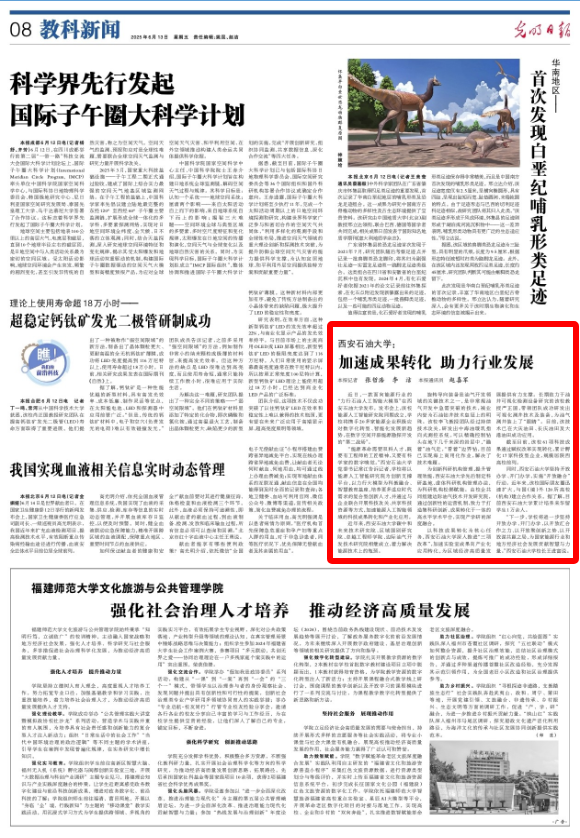 6月13日,《光明日报》教科新闻版以《西安石油大学:加速成果转化 助力行业发展》为题专题报道了学校第三次党代会以来,在创新科研机构管理、提升科技成果转化、深入推进“三项改革”、实施“开放融合”行动的主要做法及成效。小油现全文转载,以飨读者。